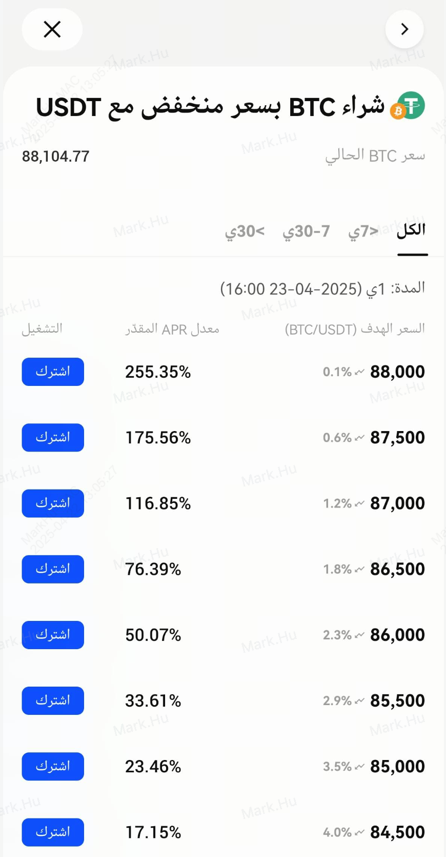3. سعر التسوية: السعر الحالي لـ BTC/USDT في نهاية مدة الاستثمار. السعر الهدف هو السعر المتوقع لـ BTC/USDT بالقرب من نهاية المدة، مما يوجه اختيارك لمنتجات "الشراء بسعر منخفض" أو "البيع بسعر مرتفع".