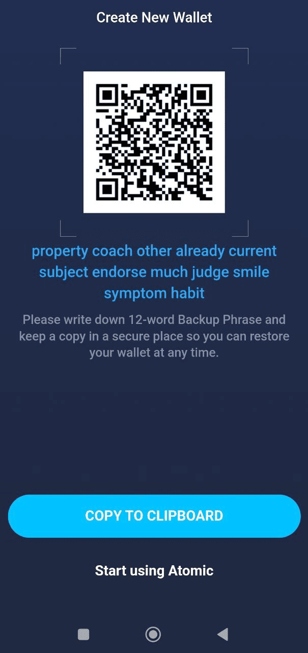 Write down the 12 word recovery phrase shown on the screen and store it offline because this phrase controls all asset recovery and cannot be reset by Atomic Wallet.