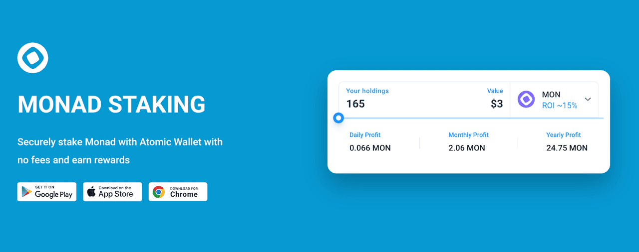 Atomic Wallet displays key network metrics such as total delegated MON, validator commissions, and staking participation, which exceeded 35% of circulating supply in early 2025, and it has supported promotional events like awarding 30 native tokens per 1,000 MON staked per month. As a fully integrated MON wallet, Atomic also lets users store, track, and swap MON alongside 1,400+ other assets across desktop, mobile, and the Web3 extension using its non-custodial encryption system.