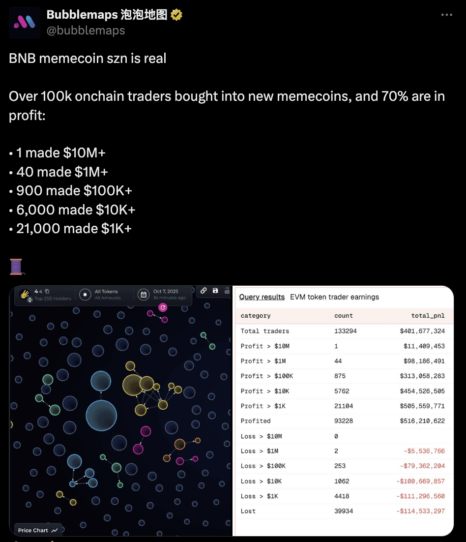 4. Over 100,000 Traders Joined the Trend: Bubblemaps reports that more than 100,000 on-chain traders participated in early BNB meme trading, with roughly 70% of wallets in profit during the initial phase and several addresses realizing multi-million-dollar gains.