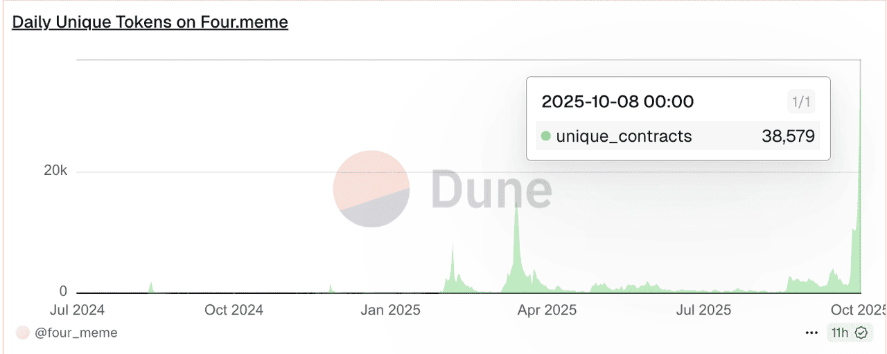 1. Over 20,000 Memecoins Launched in 24 Hours: According to Dune data, users on Four.meme created more than 20,000 new tokens within a single day, marking one of the fastest token-generation waves on any Layer-1 network in 2025.