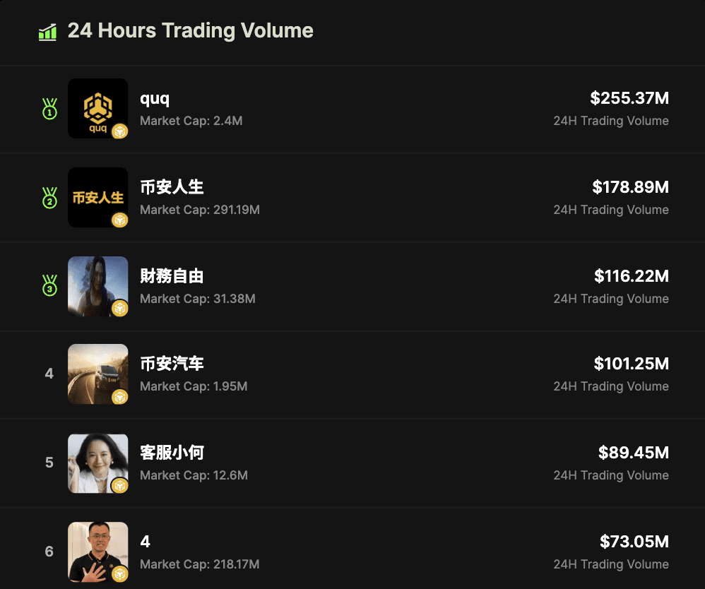 3. Chinese Memes Lead Market Activity: Chinese-language tokens such as 币安人生 (Binance Life), 客服小何 (Customer Service Xiao He), and 空气币 (Air Coin) saw rapid price increases, fueled by active trading across WeChat and Telegram communities.