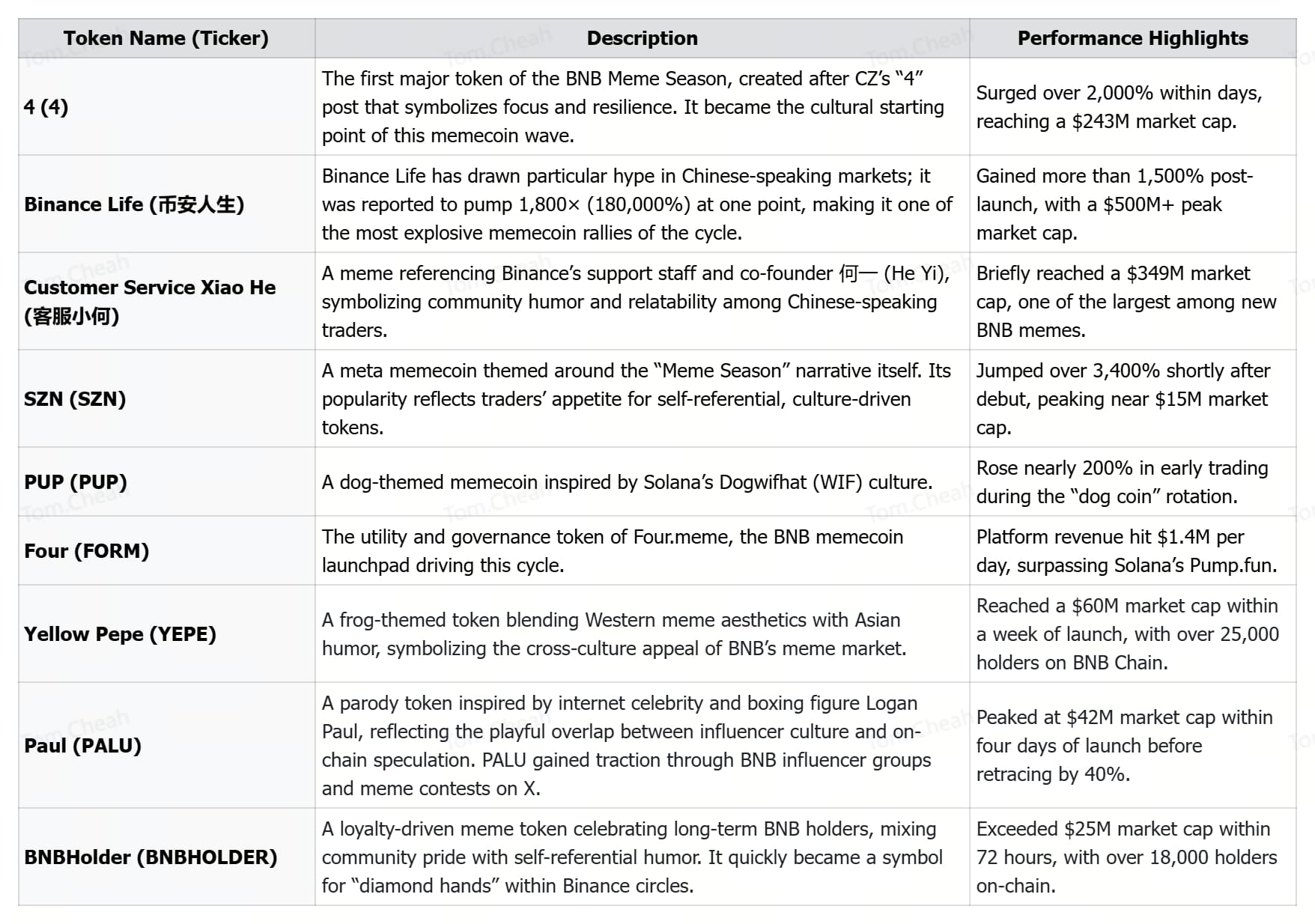 These memecoins highlight the diversity of the BNB Meme Season, blending humor, cultural identity, and speculative experimentation across global and regional communities.