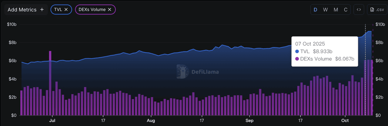 2. Daily BNB DEX Volumes Exceeded $6 Billion: DeFiLlama data shows BNB DEX trading volumes surpassed $6 billion in early October, with PancakeSwap facilitating most trades as liquidity concentrated around newly launched meme tokens.