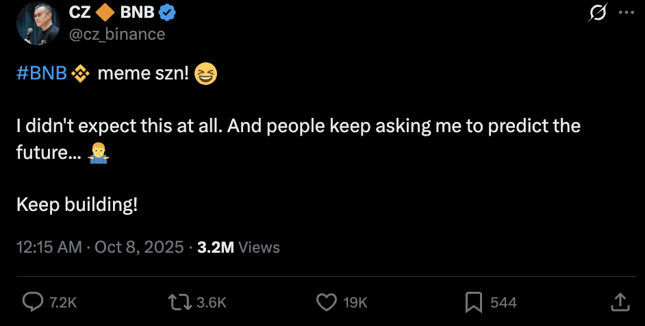 CZ tweeted about BNB Meme SZN | Source: CZ X(Twitter)