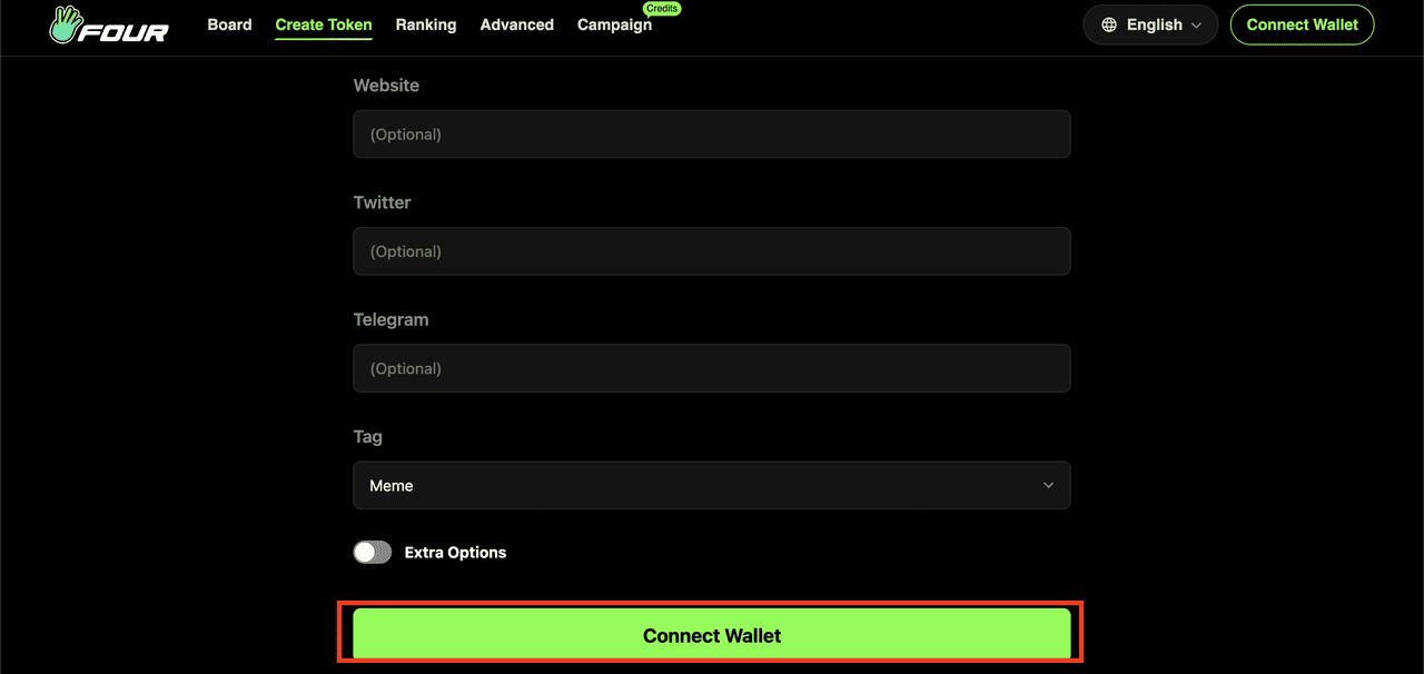 1. Set Up Your Wallet: Connect a BNB Chain–compatible wallet like MetaMask or Trust Wallet to the official four.meme site. Ensure you have enough BNB for gas fees and deployment (keep a small buffer for transactions).