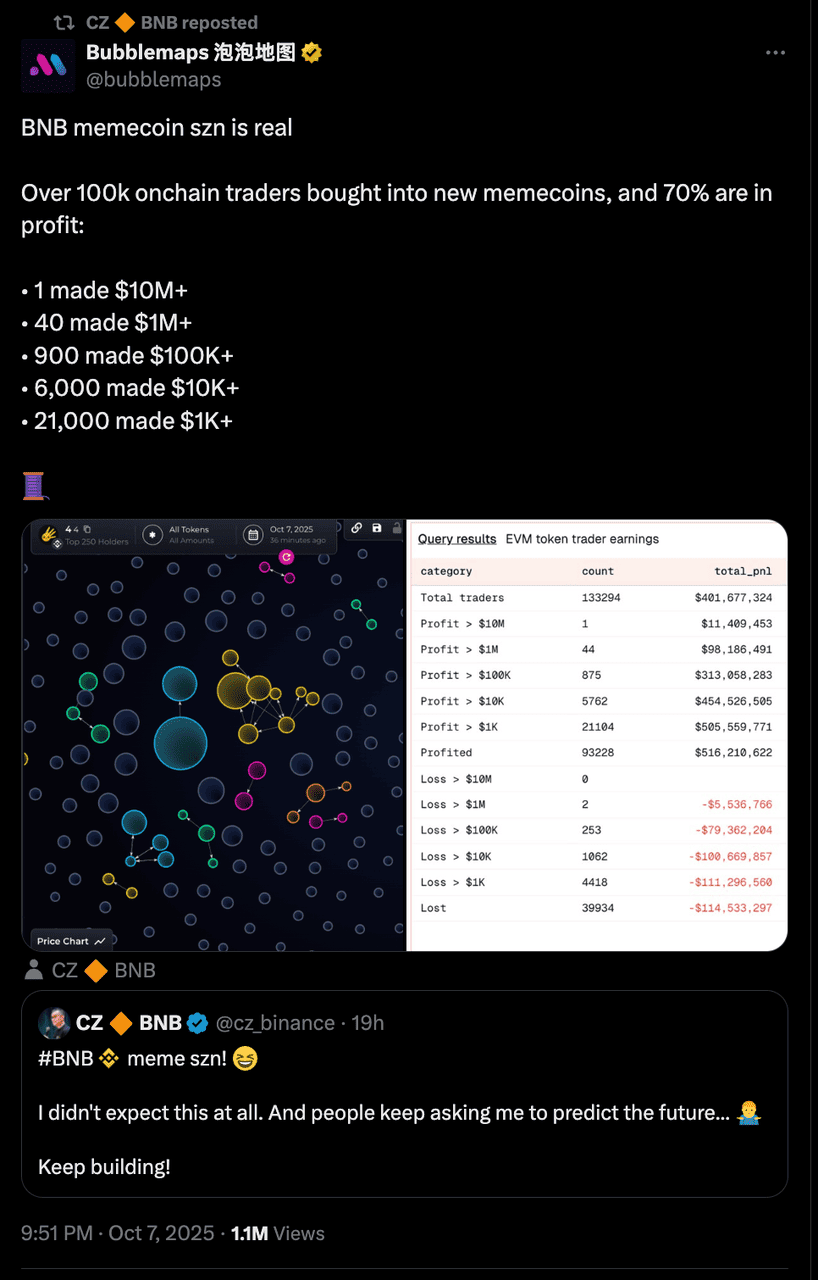 The surge began in early October 2025 when Binance founder Changpeng “CZ” Zhao posted BNB meme szn on X, sparking a viral wave of speculation across the BNB ecosystem. On-chain data from Bubblemaps and Holder shows over 100,000 new traders joined that week, with about 70% earning profits from BNB-based memes. The frenzy also pushed BNB above $1,300, briefly making it the third-largest crypto by market cap, creating a strong feedback loop between sentiment and price momentum.