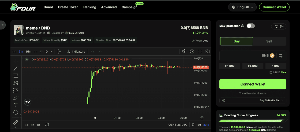 With ~3,000 TPS throughput and $0.10 average transaction fees, BNB Chain offers ideal conditions for fast, low-cost meme trading. Four.Meme leverages this efficiency, as token launches cost just 0.005 BNB (~$3) and trading fees start at 0.5%, making it accessible for small creators. This frictionless setup encourages experimentation, enabling instant entries and exits in a highly active meme market.