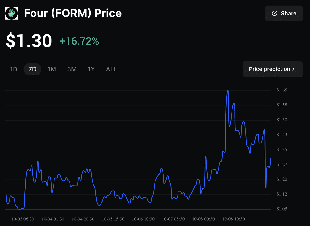 The FORM token experienced a sharp rally in October 2025, gaining over 80% in less than two weeks as trading activity and on-chain volume on Four.Meme reached record highs. The surge coincided with BNB Chain’s “Meme Coin Season”, sparked by CZ’s viral post declaring “BNB meme szn.”