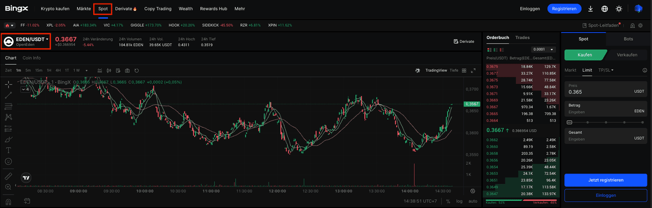 mercado spot de BingX. El trading spot es la forma más sencilla de comprar, vender o mantener EDEN sin utilizar apalancamiento, lo que lo hace ideal para principiantes.