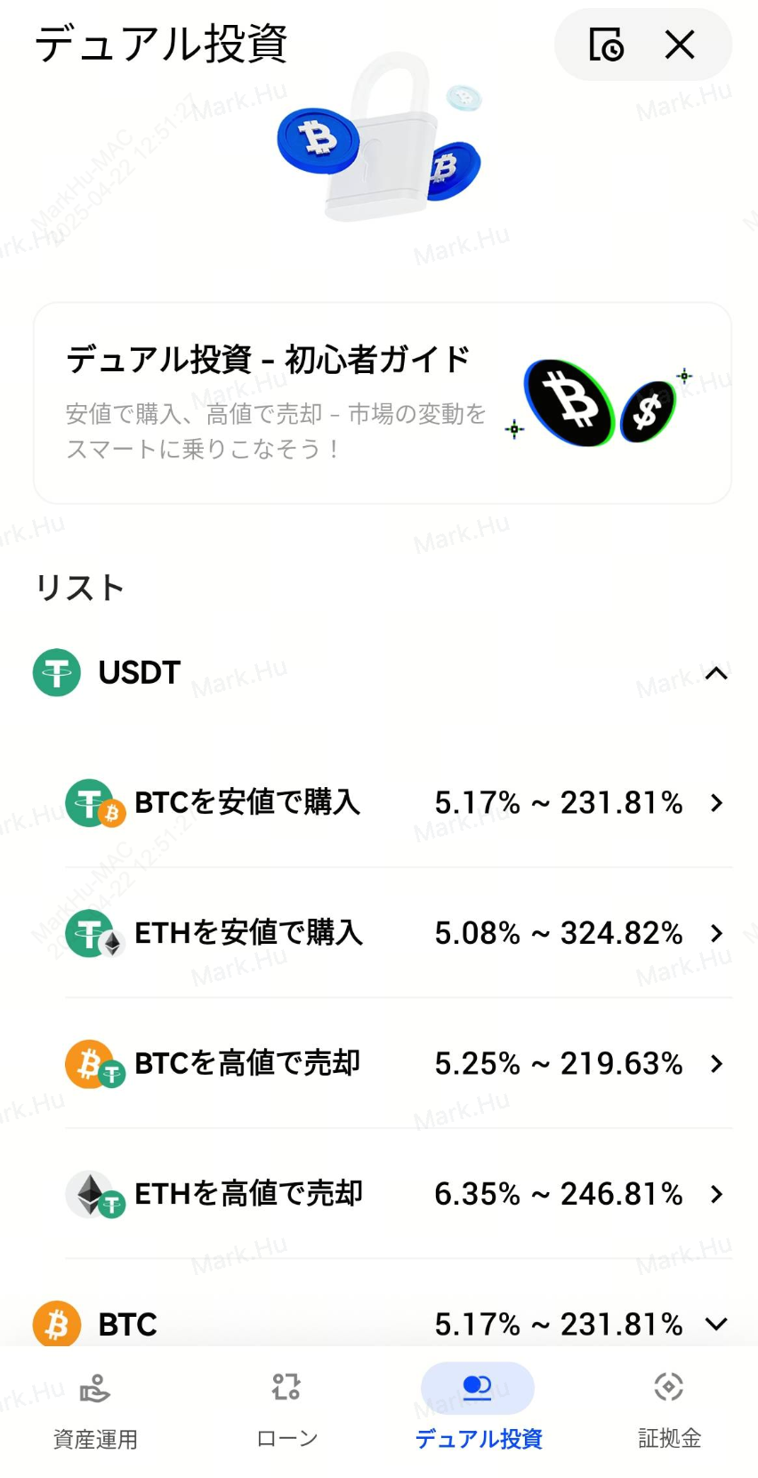 1. 買い低:USDTを投資してBTCを安く買うデュアル投資商品を購入。
