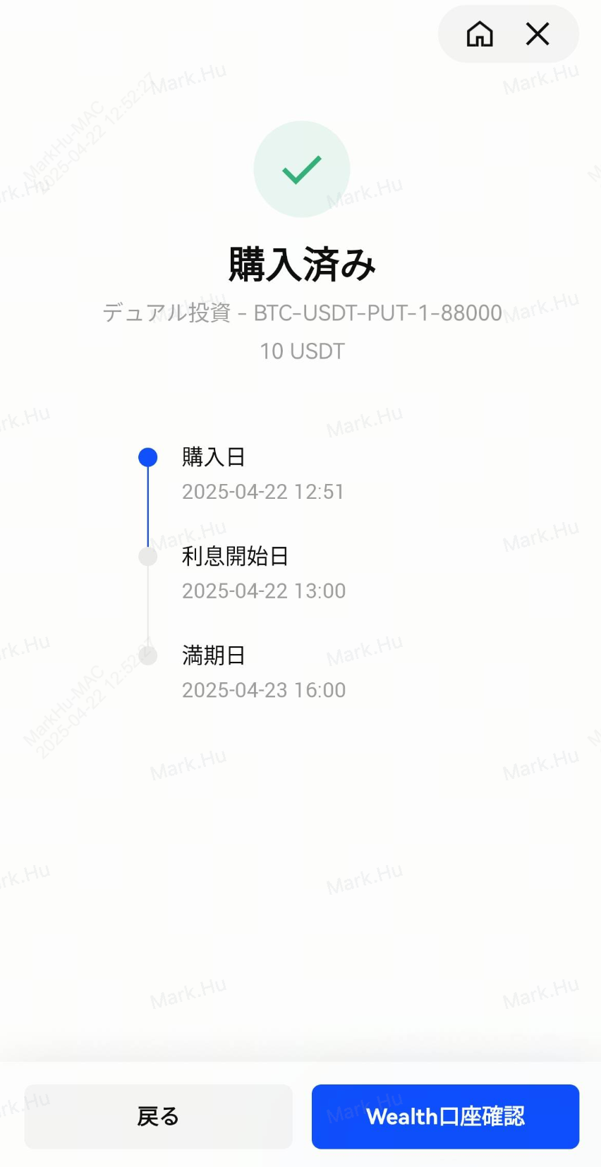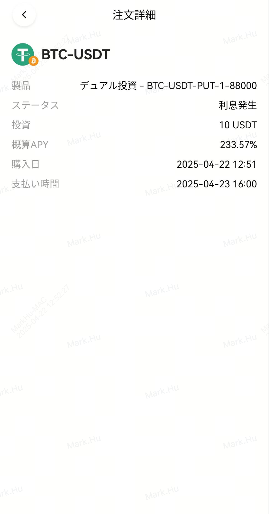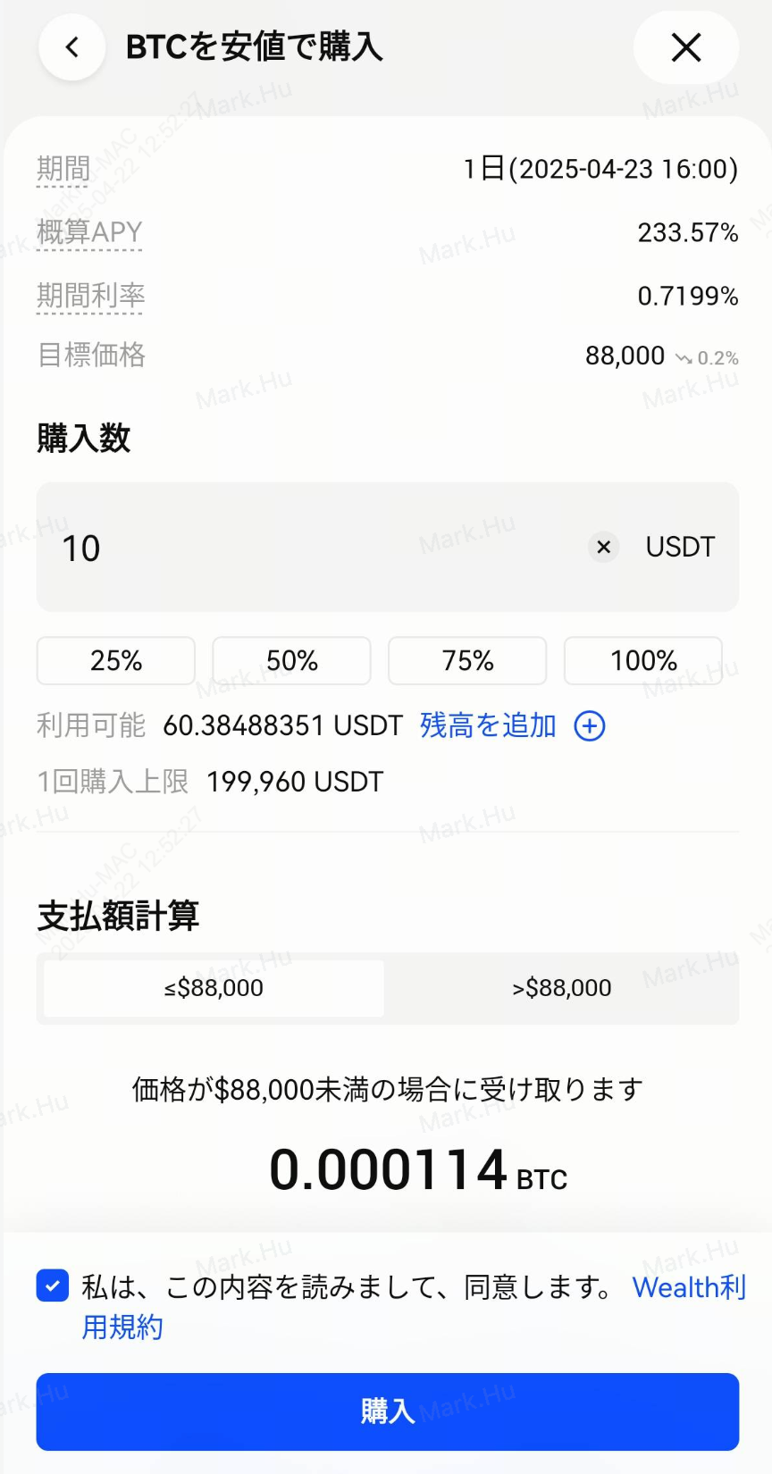 - 決済時にBTC価格が目標価格以下の場合、USDTは自動的にBTC購入に使用され、獲得した利息を受け取ることができます。