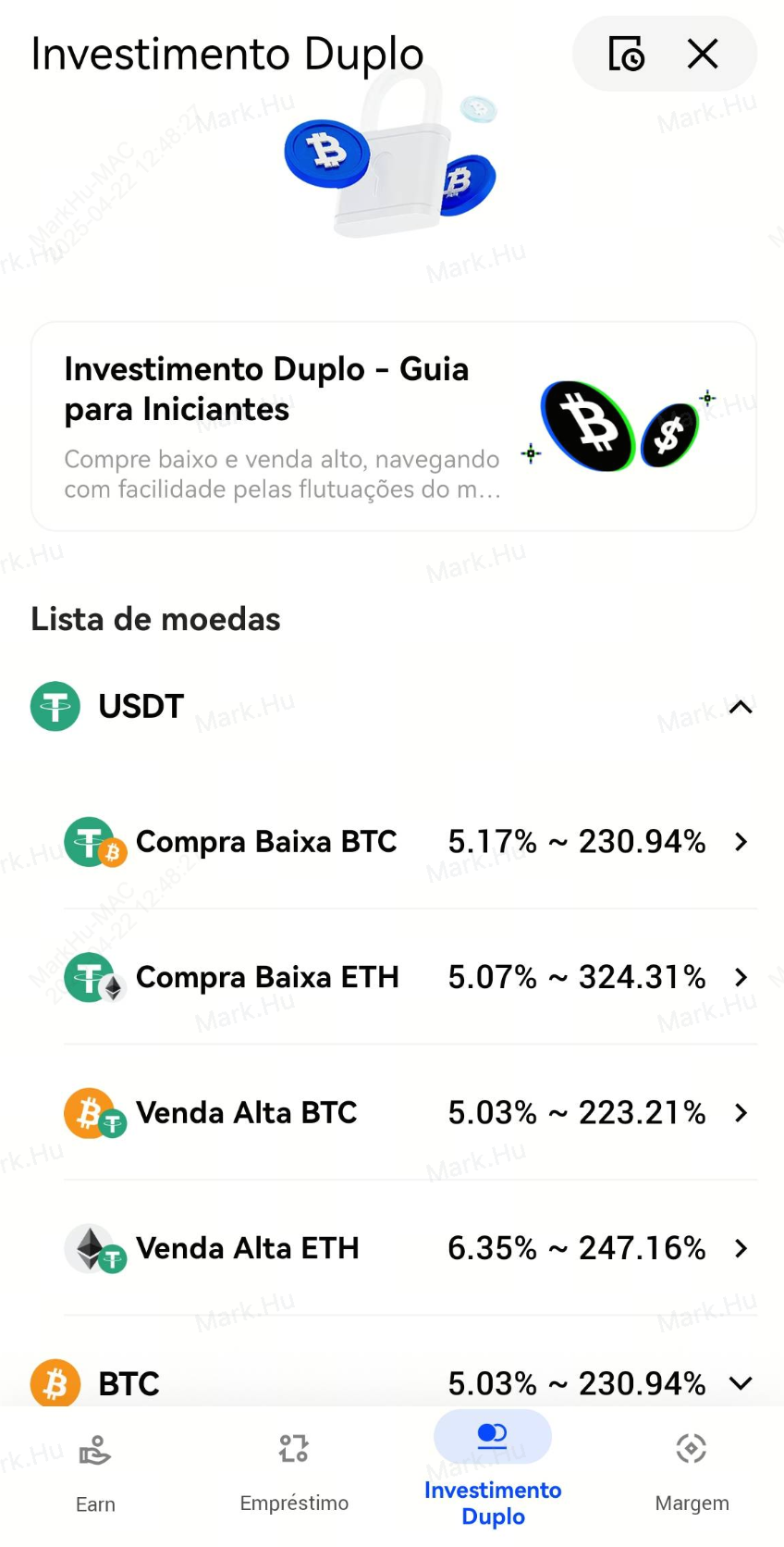 Escolha "Comprar Baixo": Invista USDT, assine "Comprar Baixo BTC" no Investimento Duplo, com o objetivo de aumentar seus holdings em BTC ou retornos em USDT.