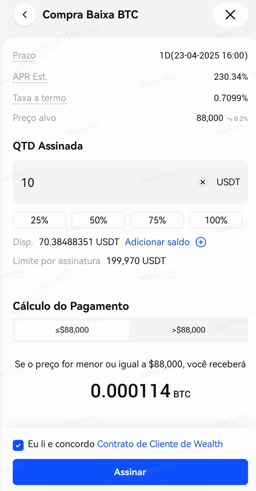 Considere um cenário em que você investe US$ 10.000 em USDT, define um preço-alvo de US$ 100.000 para BTC, com uma APR de 50% e um prazo de 7 dias.