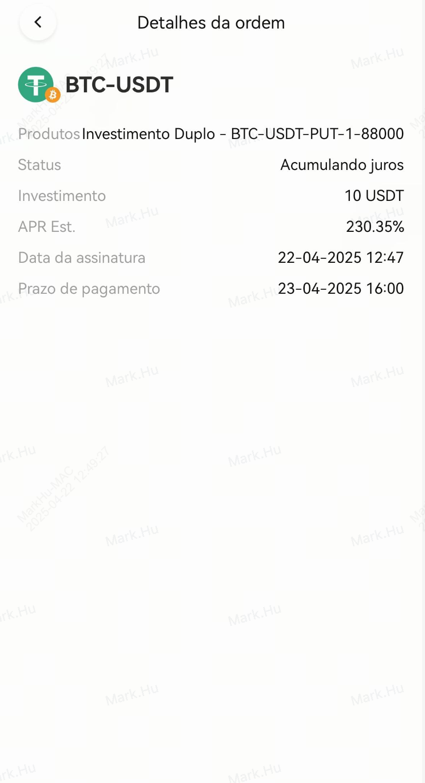 - No momento da liquidação, se o preço do BTC for ≥ ao preço alvo, seu BTC será automaticamente vendido por USDT, e você receberá os juros acumulados.