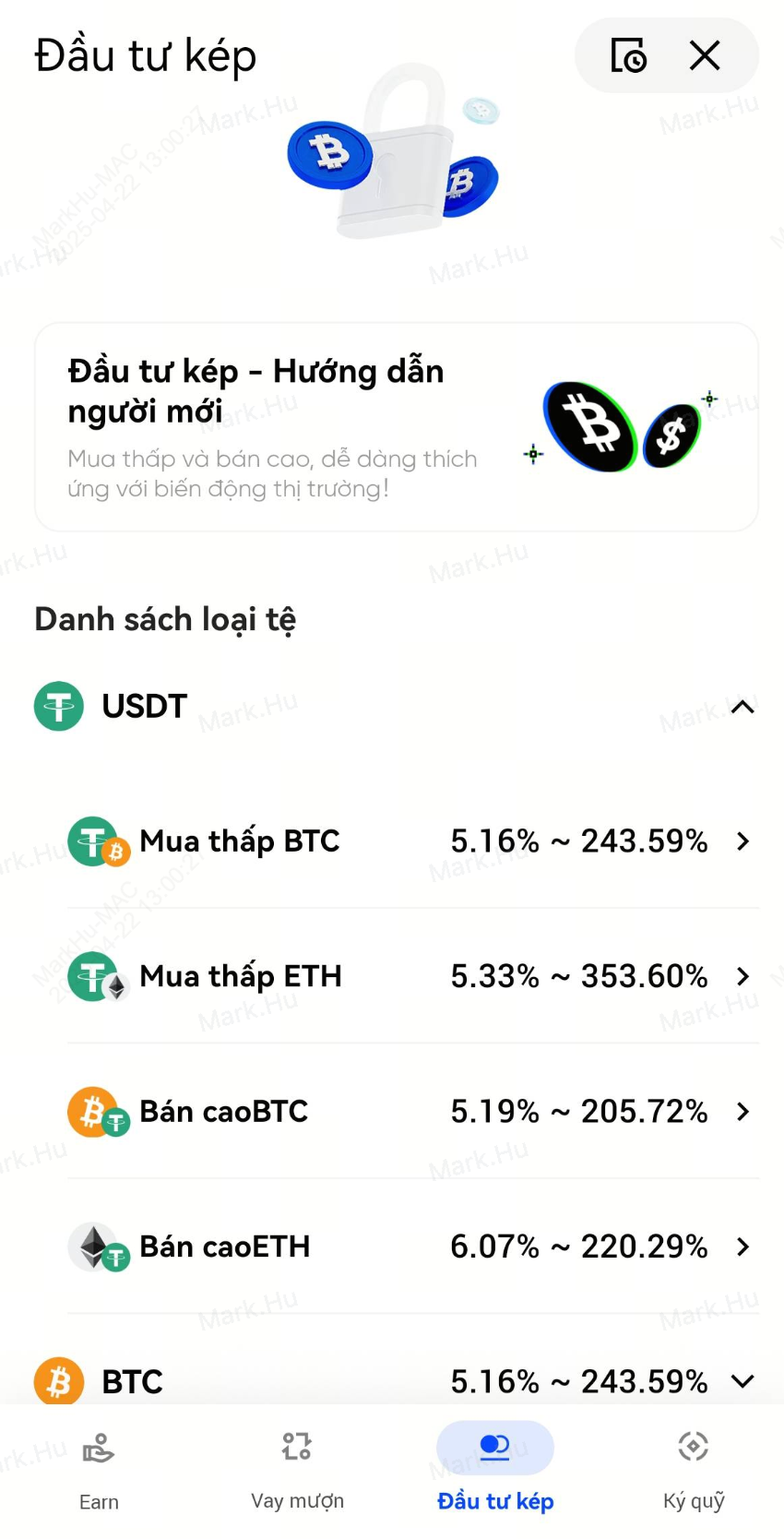 1. Mua thấp: Đầu tư USDT để ký gửi sản phẩm Đầu tư kép "Mua thấp BTC".