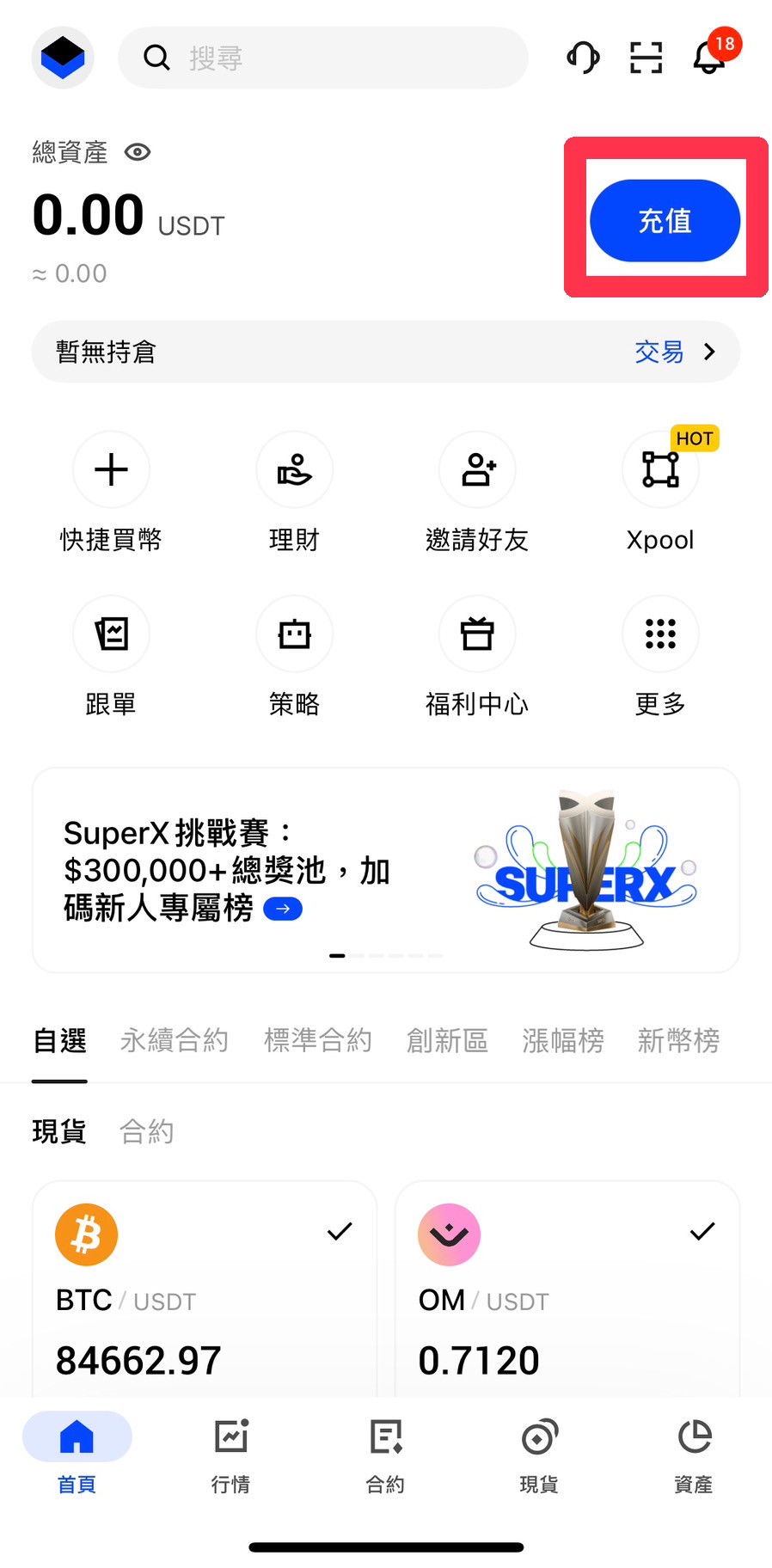 步驟一:打開 BingX APP 並登入您的帳號,點選「充值」按鈕,選擇「快捷買幣」。